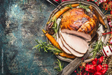 Christmas ham served with roasted vegetables and festive decorations on vintage background, top view, place for text. Christmas recipes and dishes concept