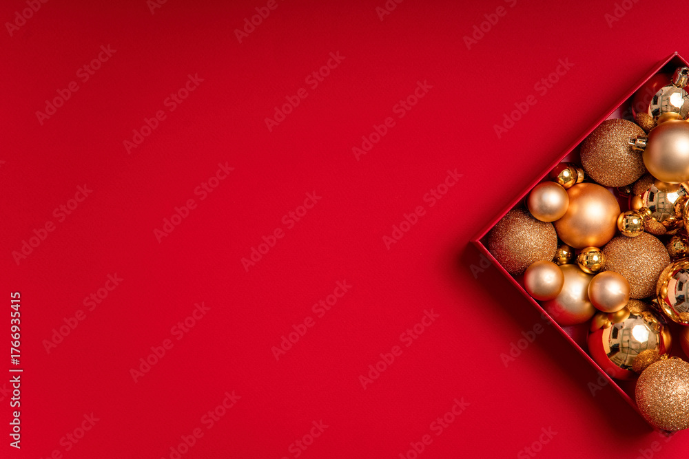 Festive red flat lay with an open box filled with gold baubles placed at the top right corner. Wide empty area on the left for text, banners and seasonal designs.