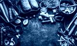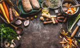 Healthy root vegetables cooking and eating concept. Various vegetables with knife and pot on dark kitchen table background , top view. Vegetarian dishes cooking