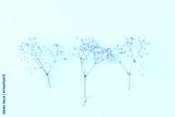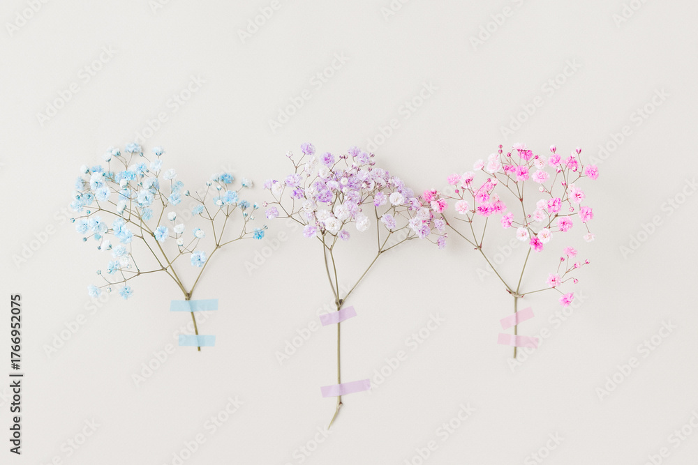 Delicate pastel flowers from floral series in blue, pink, and lilac taped to a light wall, minimal floral composition