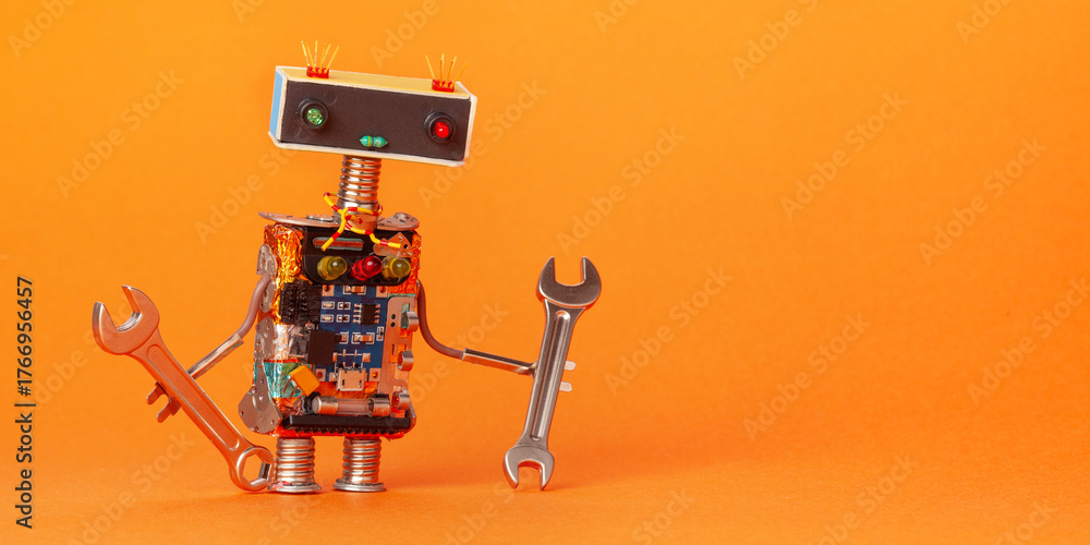 A toy mechanical robot holds repair tools. A robot mechanic handyman repairman character with a hand wrench. Orange background.