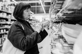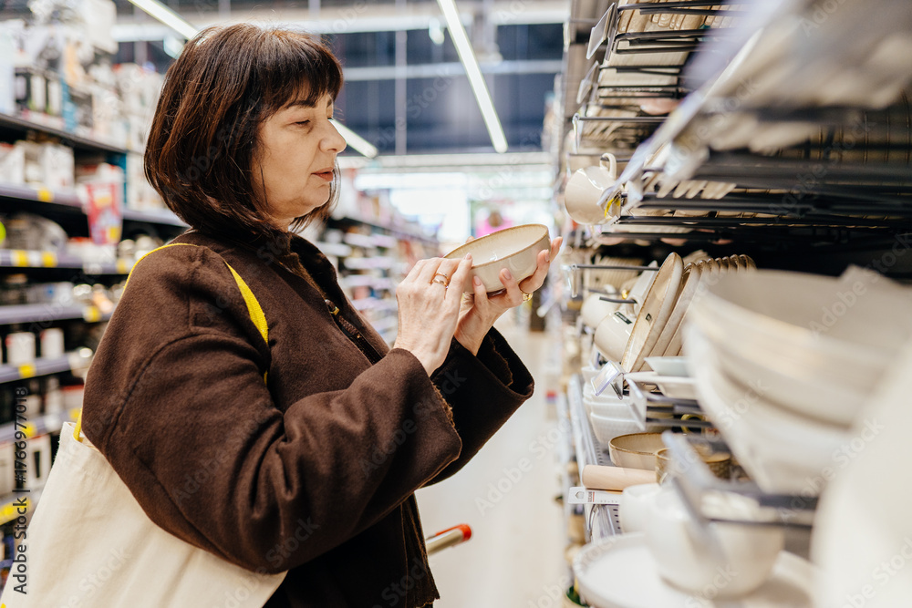Senior woman examining ceramic bowl in houseware aisle of supermarket