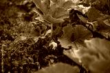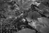 Pumpkin plant with bright yellow flower growing among large green leaves in garden