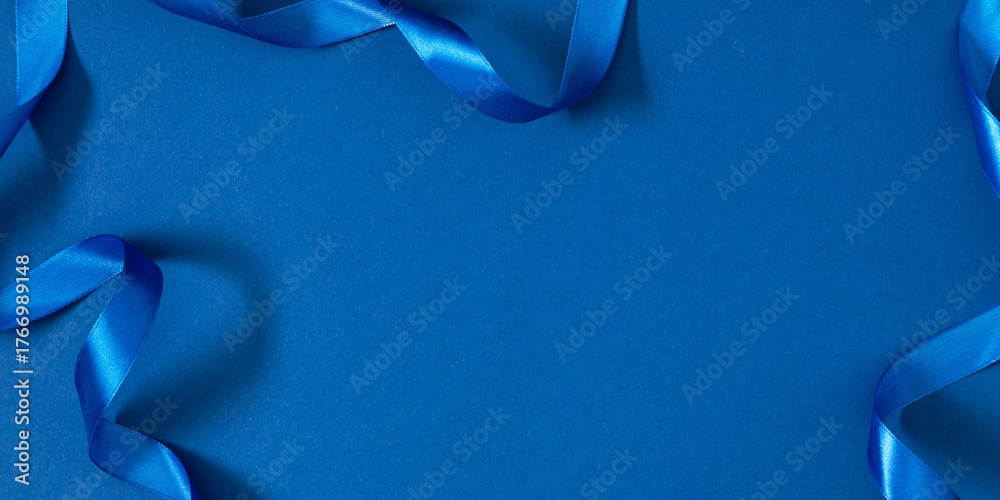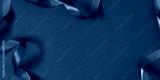 Blue satin ribbon on blue background. Minimal festive layout with copy space. Elegant background for greetings, advertising, invitations, or Christmas and New Year design.