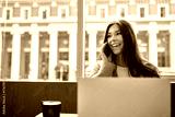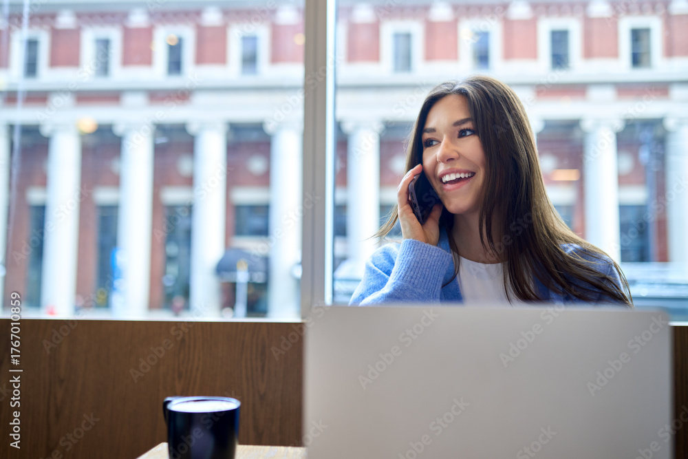Young happy business woman worker or student working on laptop computer in coworking office. Professional businesswoman employee talking on the phone sitting in cafe relaxing looking outside window.