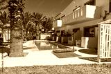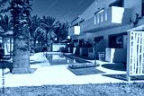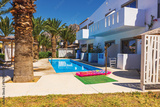Close up view of swimming pool along modern hotel building with palm trees and mountain on background of sunny summer day. Greece. Kos.