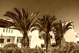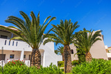 Close up view of palm trees growing near white hotel buildings on background of clear blue sky during sunny summer day. Greece. Kos.