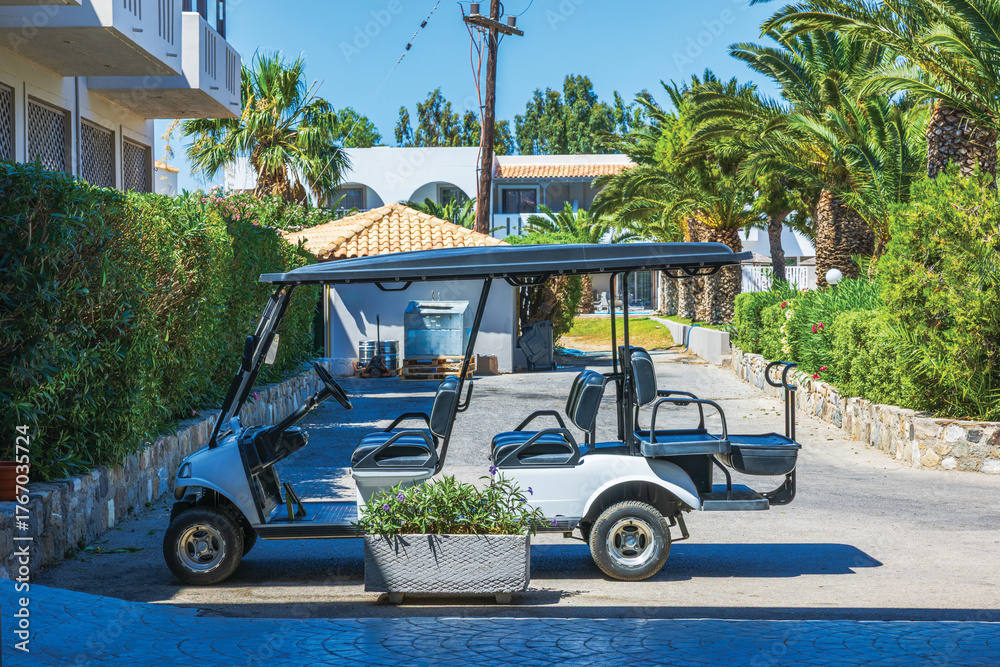 Close up view of electric golf cart parked on hotel road surrounded by palm trees and green bushes. Greece. Kos.