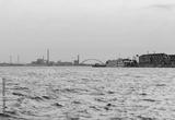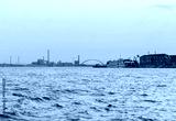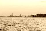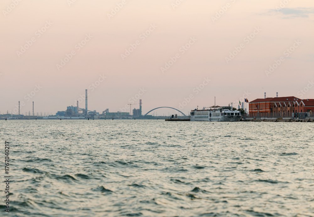 Venice, Italy - June 23, 2025: Scenic view of industrial waterfront with calm water reflecting pastel sky, featuring boats and buildings along the shoreline at dusk