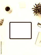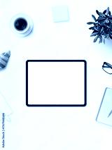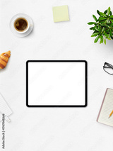 Top view of tablet with blank white screen, coffee, croissant, and notebook on white desk, ideal for digital mockup or design scene
