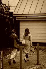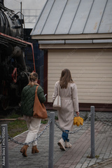 Two women walk near an old steam locomotive at the locomotive museum Povorotny Krug, one holding autumn leaves