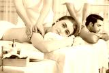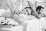 Caucasian couple customer enjoying relaxing anti-stress spa massage and pampering with beauty skin recreation leisure in day light ambient salon spa at luxury resort or hotel. Quiescent