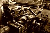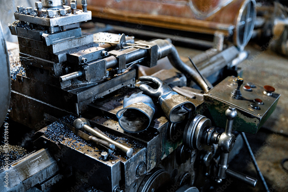 Industrial lathe machine with various tools and metal shavings, showcasing precision engineering and craftsmanship in a workshop environment with a focus on mechanical details