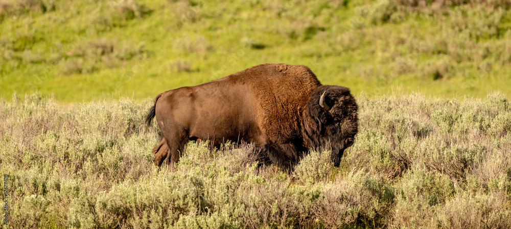 Profile Of Male Bison Crossing Through Sage Brush Field