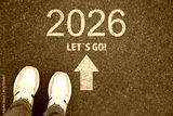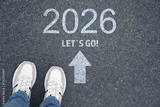 New Year. Man standing near arrow, phrase Let's Go and numbers 2026 on asphalt, top view