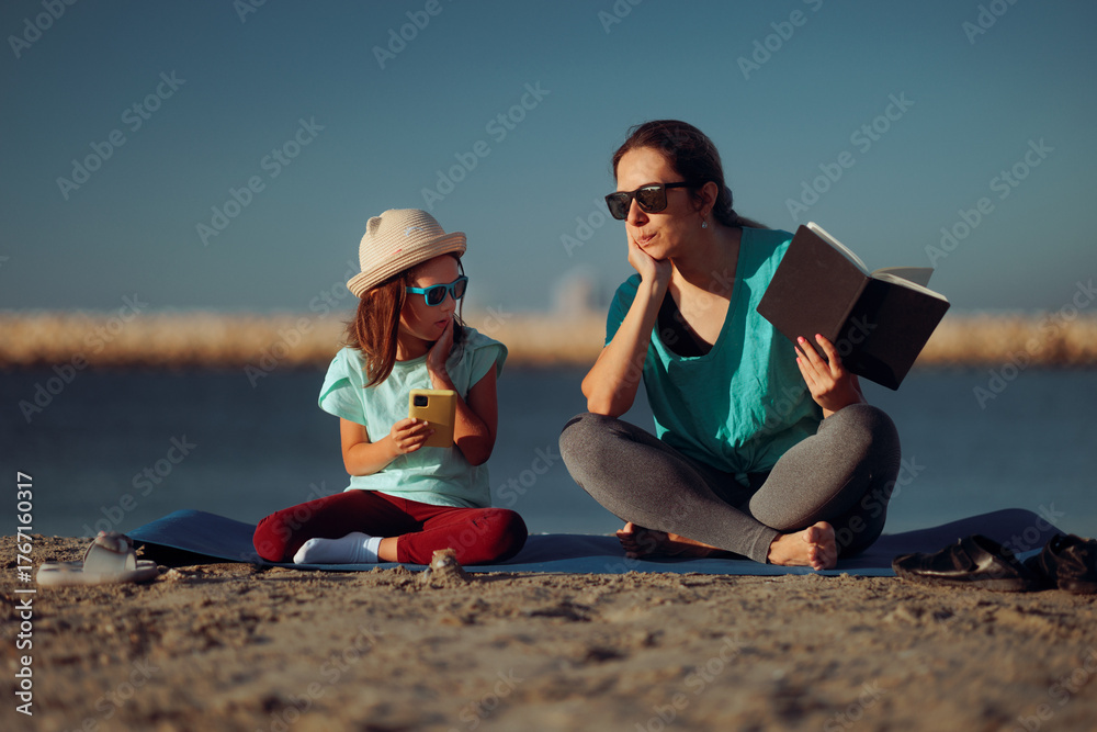 Child Using Phone While Mom Tries to read her a Story. Mom disappointing her daughter prefers technology instead of reading together