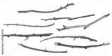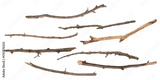 collection of natural, dry wooden sticks and broken tree branches scattered in various sizes and shapes, photographed realistically and isolated on black.