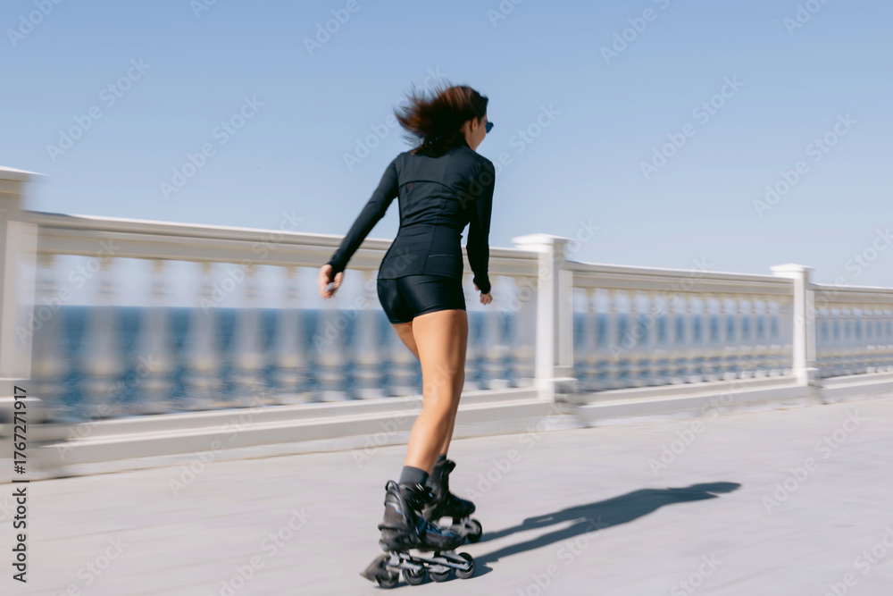 Woman rollerblading along seaside promenade in black outfit, active lifestyle and freedom concept