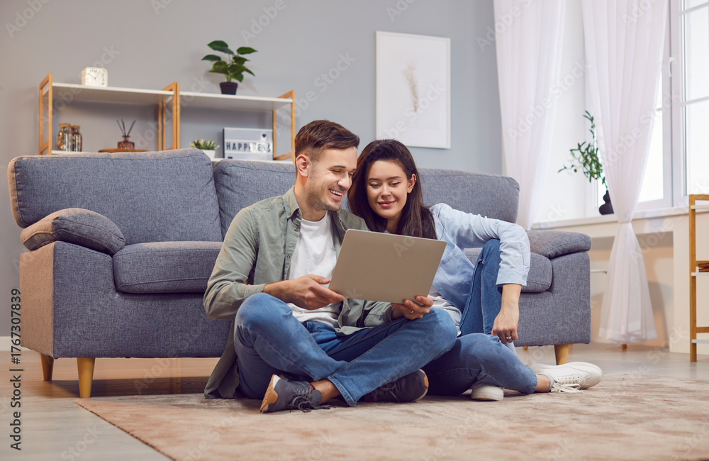 Young happy family couple sitting on floor in modern living room, looking at laptop screen. Smiling married spouse web surfing, making purchases, order online or booking tickets, watch video together