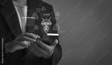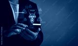 Businessman using smartphone with warning signs and AI chatbot icon, symbolizing mobile chatbot risks, data breaches, ethical AI concerns and cybersecurity threats in communication