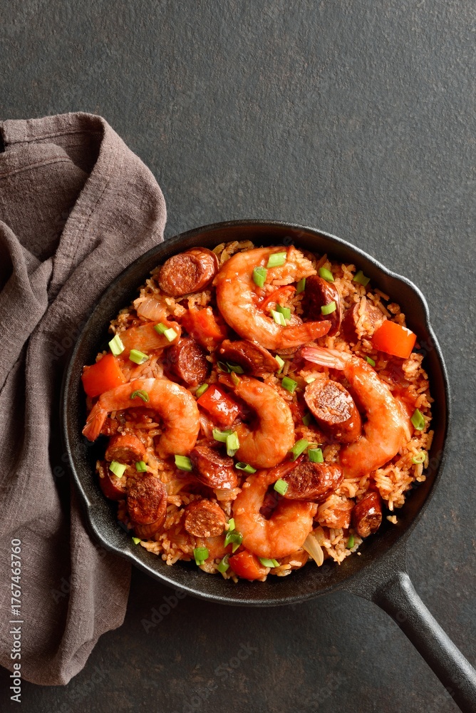 Creole style jambalaya with prawn, smoked sausages and vegetable
