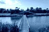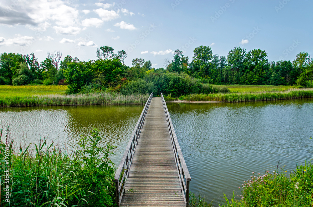 Long wooden footbridge across a creek in a nature reserve near Sintmaartensdijk, The Netherlands