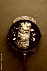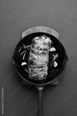 Roasted pork loin with rosemary and garlic in cast iron pan