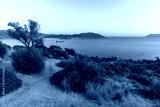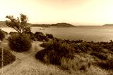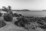 A dirt path winds through dry shrubs toward a calm blue sea. Kas, Turkey