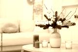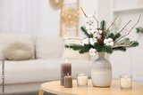 Winter composition with fir tree branches, cotton flowers in vase and burning candles on wooden table indoors, closeup. Space for text