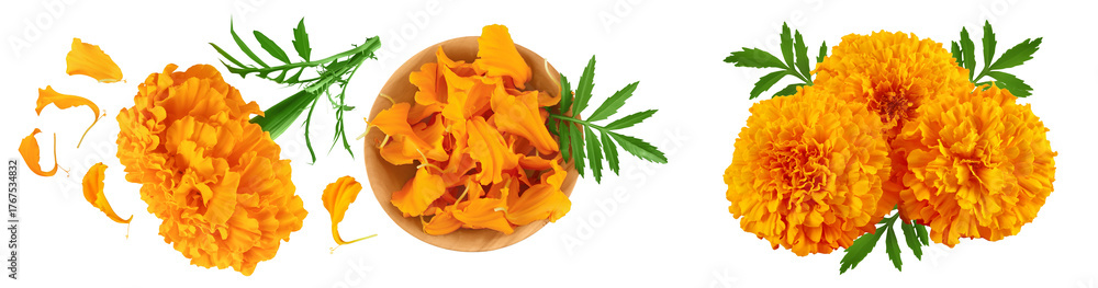 petals of fresh marigold or tagetes erecta flower isolated on white background. Top view. Flat lay