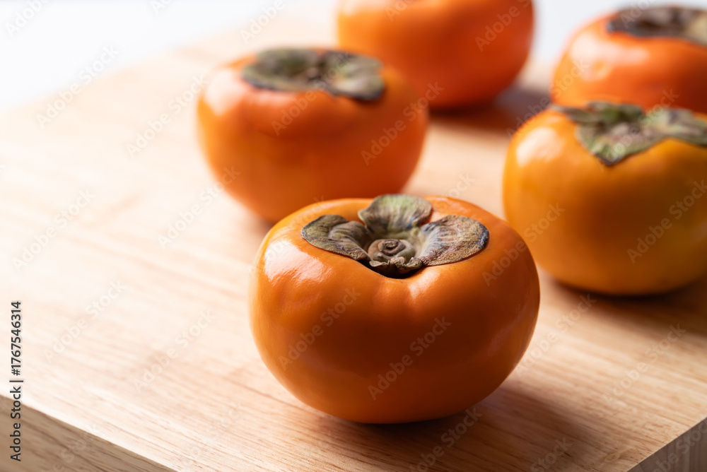 Ripe persimmon fruit on wooden background, Autumn fruit