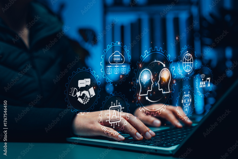Human and AI Knowledge Transfer and Collaboration Concept. Person using laptop with icons showing human brain and AI brain, symbolizing artificial intelligence, machine learning and knowledge exchange
