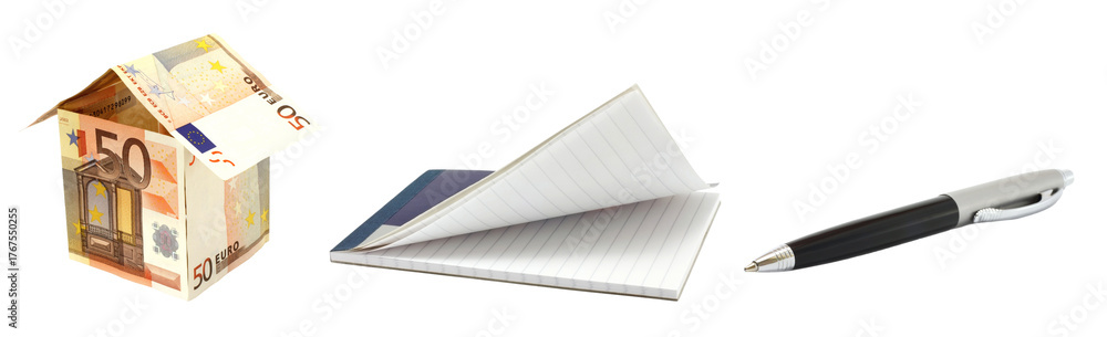 Sale of Real Estate set: house made of euro banknotes, notepad and business pen, isolated on transparent background