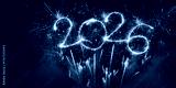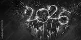 happy new year, new year's eve, silvester, new year, celebration greeting card, new year card - Year 2026 in sparkler font and firework fireworks pyrotechnic, isolated on black night sky background