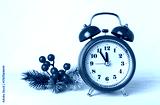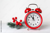 A bright red alarm clock shows five minutes to midnight on a white background.