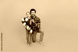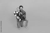 Cheerful father and daughter posing with oversized candy cane on yellow background dressed in festive clothing