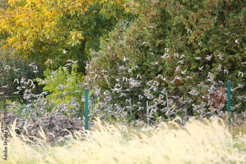 Flock of starlings in flight over a vineyard near Lake Balaton Hungary. Group of starlings flying in a huge mass in the sunset
