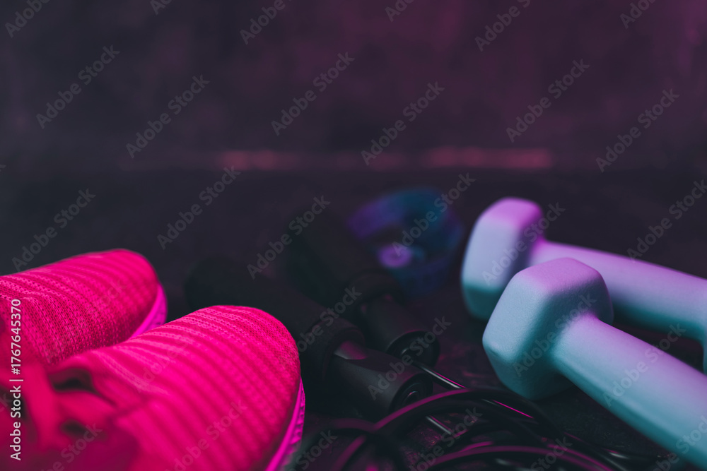 Neon-lit fitness gear on dark textured background, pink sneakers, dumbbells, jump rope and measuring tape in cyberpunk workout style