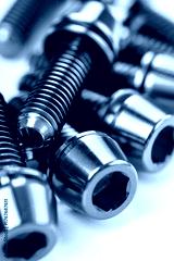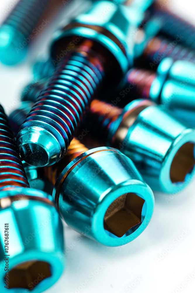 Lightweight and durable titanium bolts with hexagon head and washer on a bright white background