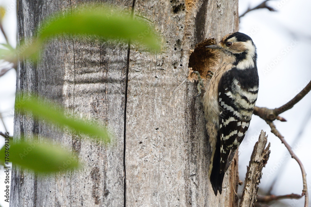 Lesser Spotted Woodpecker (Dryobates minor) female pecking a hole in a dry tree trunk — rare bird species in the Czech Republic