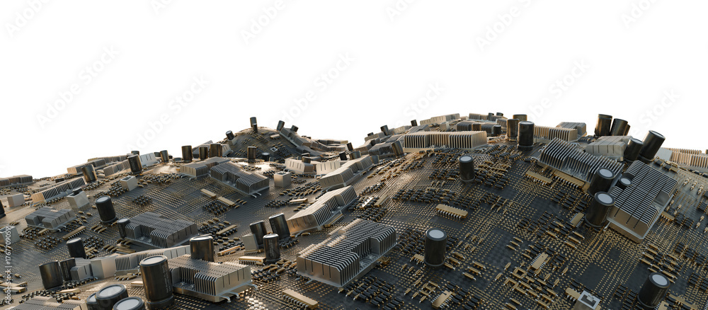 Futuristic motherboard landscape with electronic components. 3D rendering.