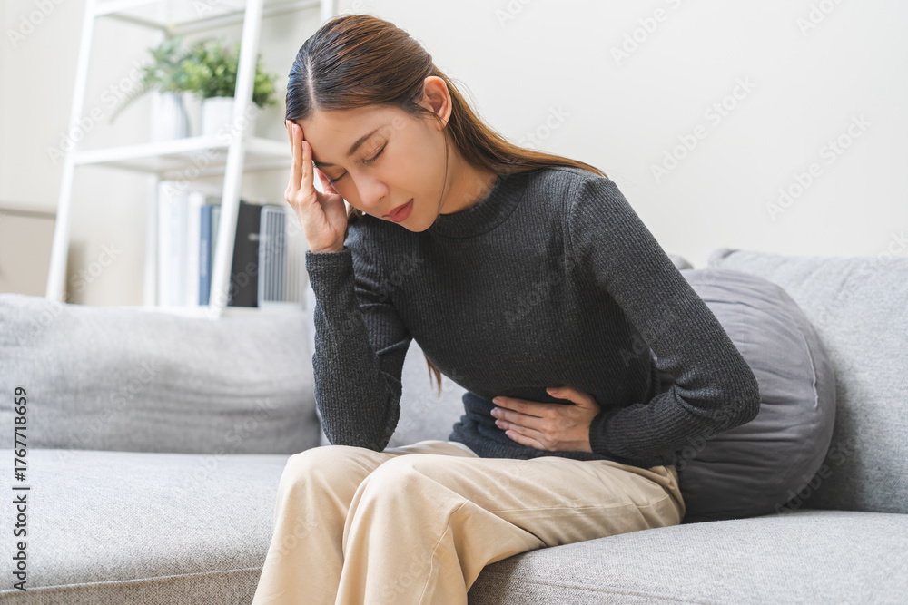 Flatulence ulcer, asian young woman, girl hands in belly, stomach pain from food poisoning, abdominal pain and digestive problem, gastritis or diarrhea. Abdomen inflammation, menstrual period people.