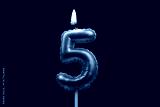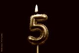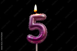 Burning pink birthday candle with hearts isolated on black background, number 5