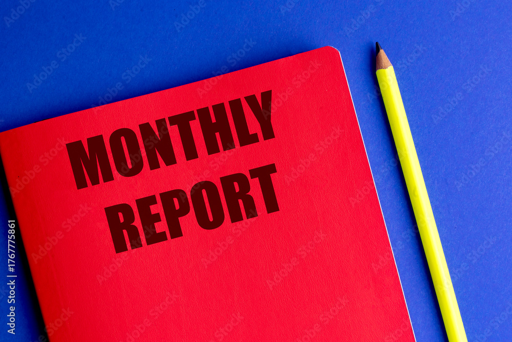 MONTHLY REPORT text on red notebook with pen on blue background