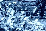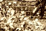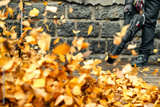 Worker holding leaf blower and clearing yellow leaves in motion, autumn maintenance and outdoor cleaning concept