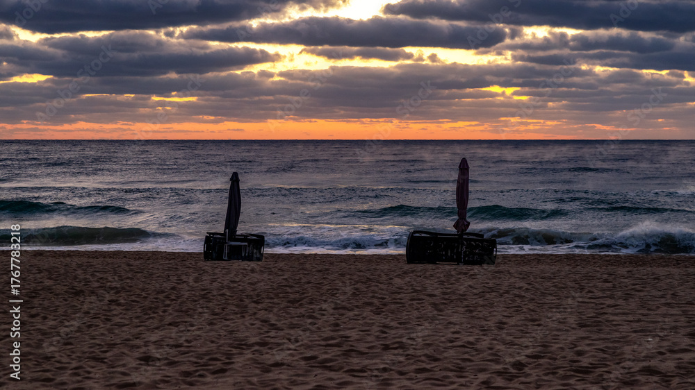 Sunrise over calm sea and sandy beach with two closed umbrellas
