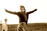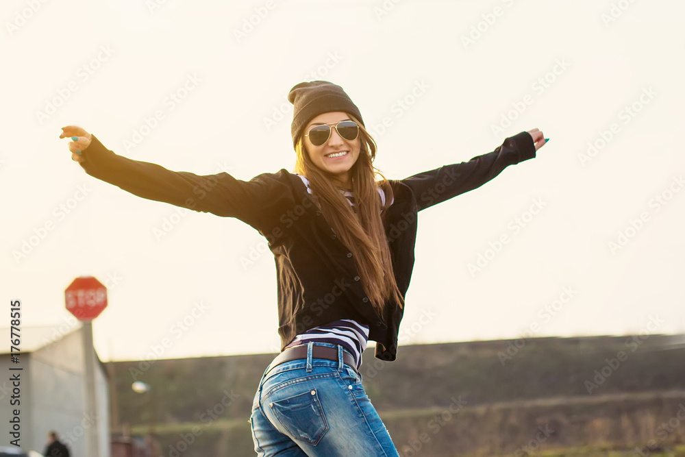 Young beautiful girl in glasses runs at sunset along the streets of the city.