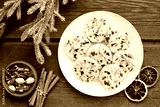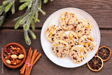 Christmas holiday cranberry orange icebox cookies. Top down view table scene on a dark wood background.