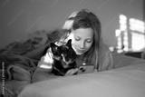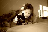 Morning moment — preteen girl with her chihuahua dog in bed using smartphone