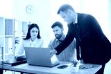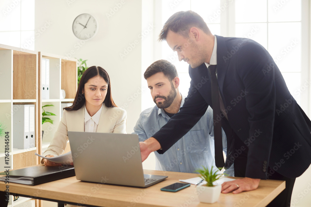 Company employees talking with colleagues on workplace in office looking at laptop monitor screen discussing work projects. Young business people coworkers working at the desk having a meeting.